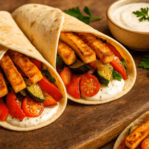 Wraps füllen: Mit Joghurt bestreichen, Ofengemüse und Halloumi-Tofu hineingeben, optional mit frischen Kräutern garnieren.